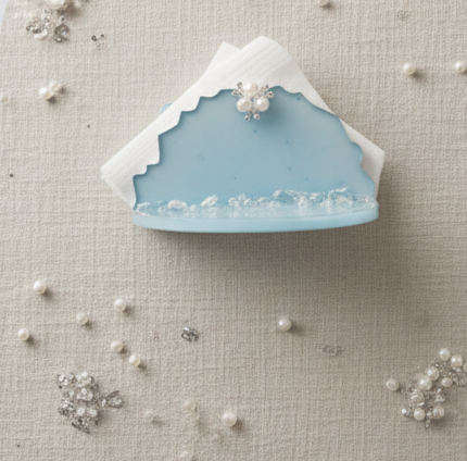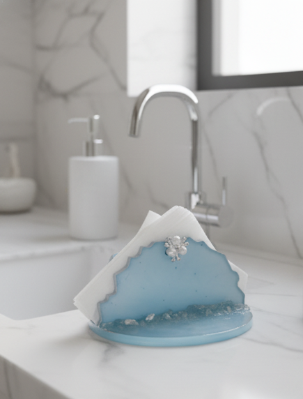 Transform a simple necessity into a piece of decorative art with our Blue Resin Napkin/Tissue Holder. Hand-poured in a soothing, semi-transparent seafoam blue, the base is infused with glittering, crushed crystal-like stones, evoking the calm of the ocean floor. The elegant, wavy edge is crowned with a sophisticated pearl and rhinestone brooch accent, adding a touch of timeless glamour to your kitchen island, dining table, or vanity.