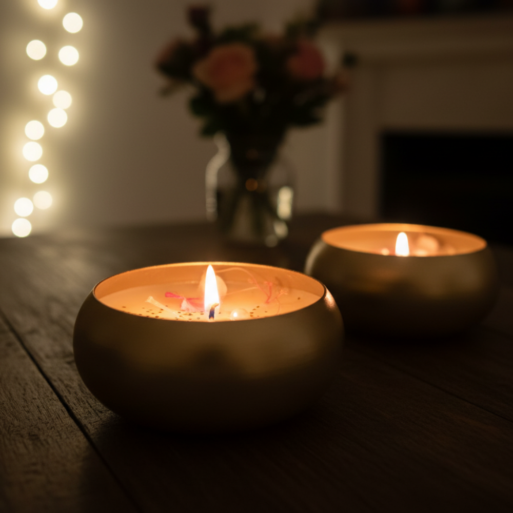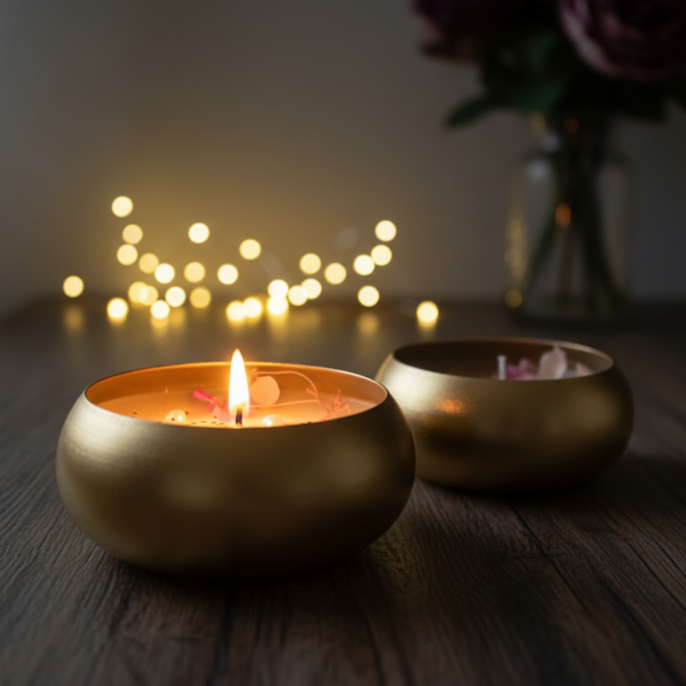 Illuminate your space with the timeless elegance of our Urli Candle. Hand-poured soy wax in a golden, traditional design. Perfect for Diwali & home decor.