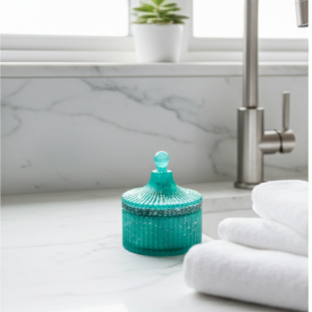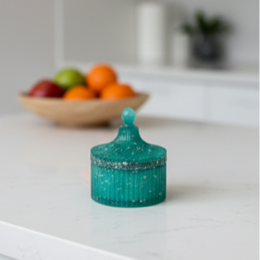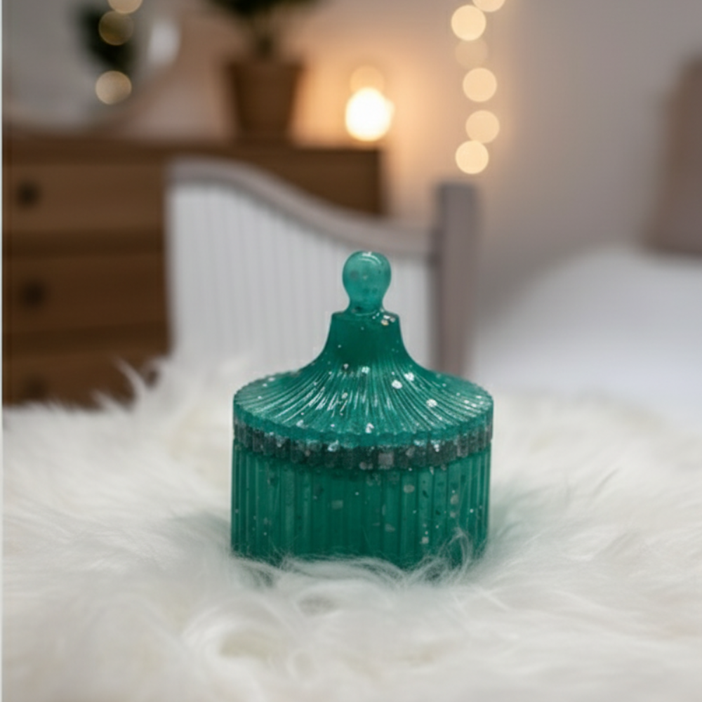 Add a touch of nostalgic elegance to your space with our exquisite Fluted Resin Trinket Jar. Hand-poured in a stunning, deep emerald green and finished with delicate vertical ribbing, this jar looks like a treasured piece of antique glass. The addition of subtle glitter or shimmering flakes catches the light beautifully, making it an instant focal point on your vanity, nightstand, or coffee table. Perfect for storing jewelry, cotton swabs, or simply as a decorative accent.