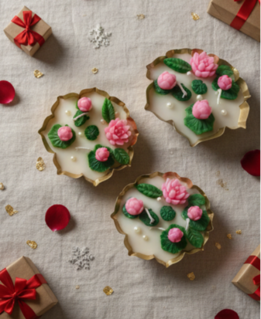 Bring the serene beauty of a miniature aquatic garden into your home with our Hand-Sculpted Lotus Urli Candle Set. Each candle features a breathtaking scene, where delicate pink lotus buds and deep green leaves are meticulously sculpted from wax and nestled on a creamy white base, accented with tiny, shimmering pearl-like wax beads. Encased in a traditional, scalloped brass-toned Urli holder, this set is a truly unique piece of functional artistry.